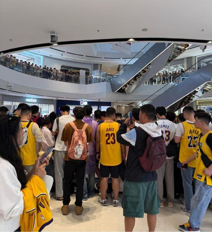 今日,成都为雷暴雨天气,但仍有大量球迷和粉丝聚集在万象城等待詹姆斯的到来。